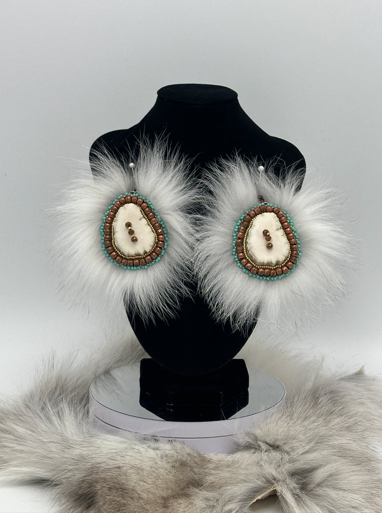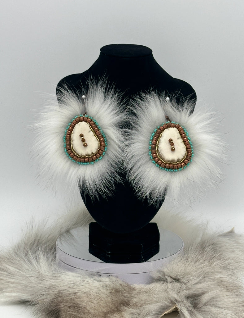 Featured Pieces: 24k Gold, carved caribou antler, firestone crystals, copper beads, blue fox furs, traditional hometan hide