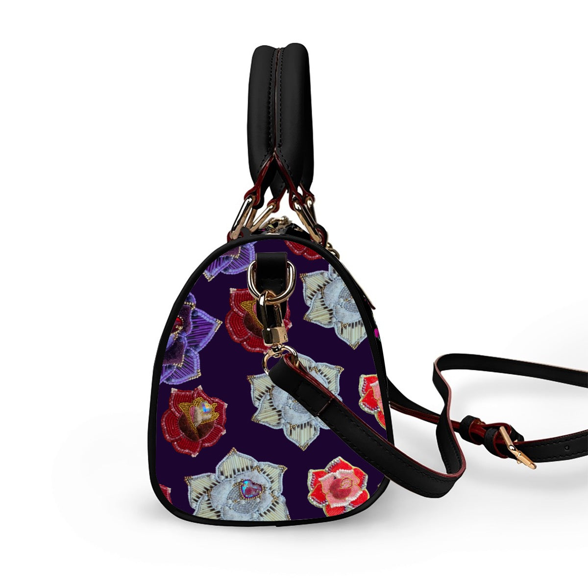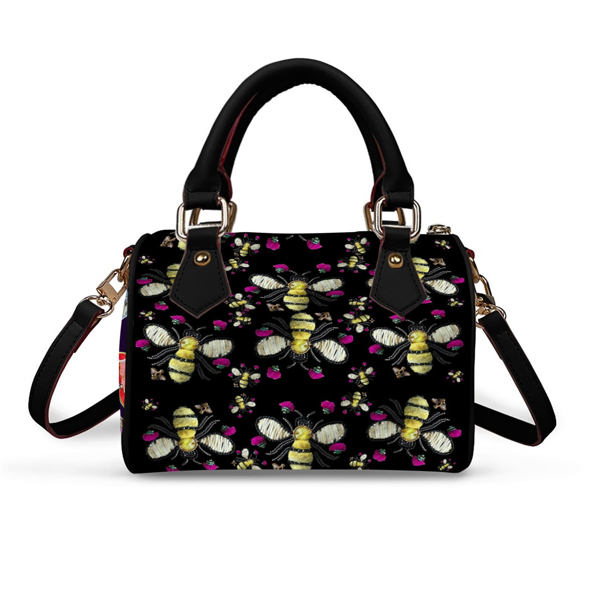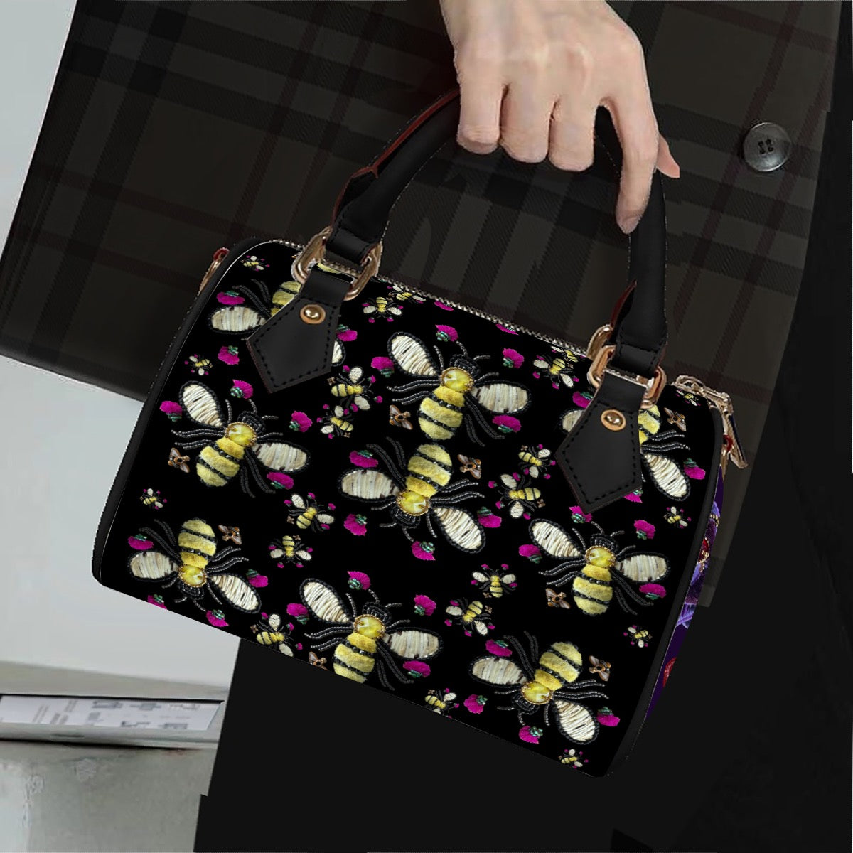 Black Roses W Bees Leather Handbag - Classic Barrel-Shape